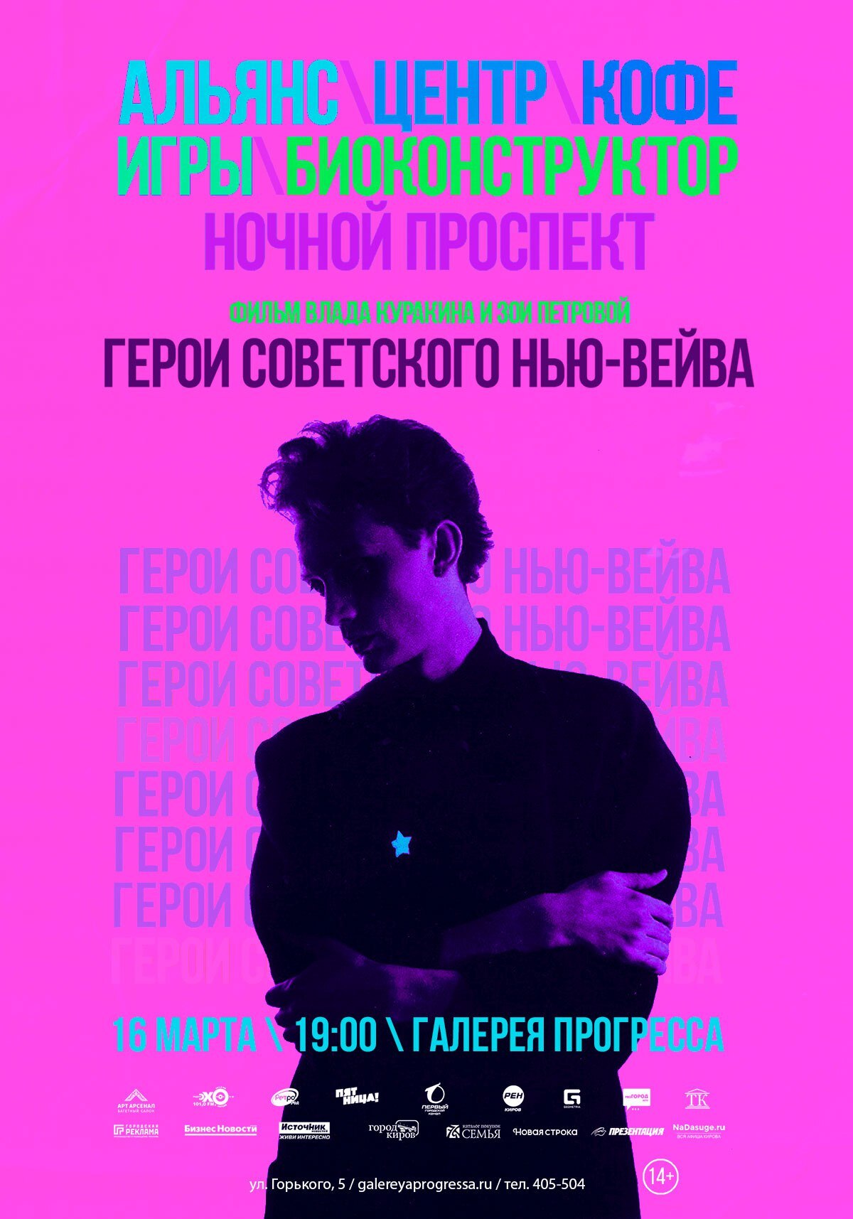 16 марта, четверг — 19:00 в Галерея Прогресса пройдет показ документального фильма «Герои советского нью-вейва» (2016) режиссеров Влада Куракина и Зои Петровой. Жанр: музыкальный, исторический.